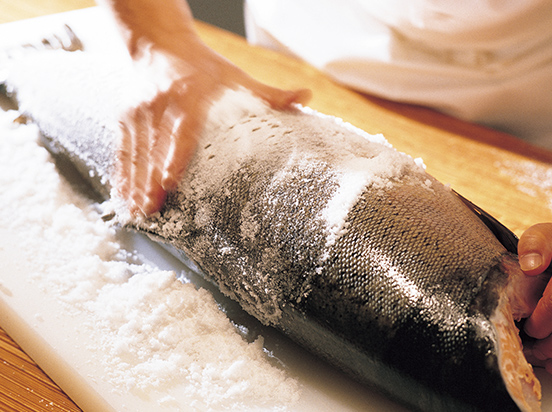 脂の乗ったキングサーモン1匹1匹に丹念に塩をあて、熟成を経て身おろしを行う職人技。旨みを閉じ込めながら切り身を焼き上げ、