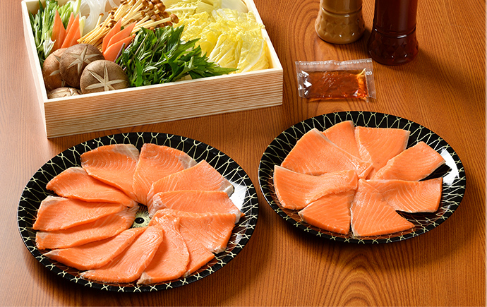 キングサーモンしゃぶしゃぶではハラスはもちろん背もセットし、良質のサーモンを余すところなく味わえる、加島屋自慢の味覚である。