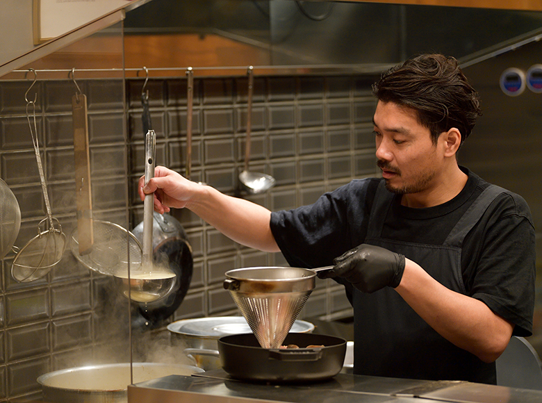 ガラの処理を丁寧に行い、ゼラチン質や脂肪をいかに引き出すかを試行錯誤した「鶏白湯」など、本店で学んだ技を反芻しながら、その日その日の最高の仕上がりを目指している。